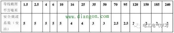 說(shuō)明:十下五是指導線(xiàn)截面在10平方毫米以下,每平方毫米的安全電流為5安培;百上二是指導線(xiàn)截面在100平方毫米以上,每一平方毫米安全電流為2安培;二五三五四三界是指導線(xiàn)截面在16平方毫米、25平方毫米,每1平方毫米安全電流為4安培,導線(xiàn)截面在35平方毫米和50平方毫米,每1平方毫米安全電流為3安培;七零、九五兩倍半是指每1平方毫米的安全電流為2.5安培;裸線(xiàn)加一半,銅線(xiàn)升級算是指截面的裸導線(xiàn),可按絕緣導線(xiàn)乘以1.5倍計算安全電流,同截面的銅導線(xiàn)按鋁導線(xiàn)大一線(xiàn)號等級計算安全電流;穿管溫度八、九折是指導線(xiàn)穿管乘系數0.8,高溫場(chǎng)所實(shí)用乘以系數0.9。www.diangon.com